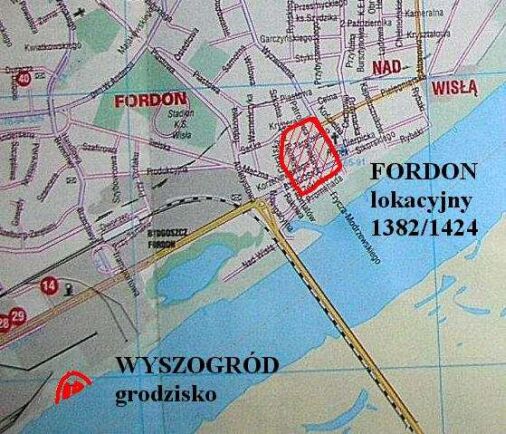 sporów i walk kujawsko-pomorskich. Według legendy, w 997 r. w Wyszogrodzie zatrzymał się Święty Wojciech zmierzający z misją chrystianizacyjną do Prusów. Miał on wówczas konsekrować kaplicę pod wezwaniem Marii Magdaleny. Nie istnieją jednak żadne naukowe przesłanki, które potwierdzałyby istnienie grodu już pod koniec X wieku. Historycy uważają, że Wyszogród został zbudowany w 2 połowie XI wieku przez Pomorzan. Miał on zastąpić, jako ośrodek lokalnej administracji, starszy gród w podbydgoskich Strzelcach Dolnych. Pierwotny Wyszogród był grodem pierścieniowatym (wklęsłym) o średnicy 130 m. Otoczony był wałem zbudowanym w konstrukcji rusztowej oraz fosą. Po pożarze został odbudowany i nieco powiększony (średnica 148 m, powierzchnia ok. 172 a). Jednak i ten gród nie przetrwał długo, bowiem został spalony w czasie trwającego osiem dni oblężenia prowadzonego przez Bolesława Krzywoustego w 1113 roku. Po śmierci Krzywoustego Wyszogród znalazł się najpewniej w dzielnicy Mieszka III Starego. Książę nadał go Januszowi Wojsławicowi z rodu Powałów za zasługi w czasie walki juniorów z księciem Władysławem II Wygnańcem. Miało to miejsce prawdopodobnie w 1145 roku. W okresie tym zbudowano drugi, wewnętrzny wał przez co nastąpiło zmniejszenie powierzchni grodu. Przekaz z 1198 roku informuje, że Wyszogród posiadał kościół (niestety nie znamy jego patrona) prawdopodobnie ufundowany przez właścicieli. Rozwinęło się również podgrodzie z osadą targową, karczmą i komorą celną. W 1207 po wygaśnięciu rodu Powałów Wyszogród dostał się w ręce księcia pomorskiego. Odtąd stał się on przedmiotem nieustannych zmagań kujawsko-pomorskich. Już w 1238 wybuchła wojna pomiędzy księciem pomorskim Świętopełkiem i kujawskim Kazimierzem (synem Konrada Mazowieckiego). Działania skoncentrowały się jednak przede wszystkim na nieodległej Bydgoszczy. W tym okresie Wyszogród stał się siedzibą kasztelana. Pierwszym kasztelanem wyszogrodzkim został bliski współpracownik Świętopełka - Arnold, wzmiankowany właśnie w 1238 roku. Na początku XIII wieku gród uległ kolejnej przebudowie. Wały zwieńczono konstrukcjami izbicowymi, a w środku wytyczono wewnętrzny gródek stożkowaty, przecinając majdan fosą wewnętrzną. Następny konflikt, który wybuchł na przełomie października i listopada 1242 roku dotyczył bezpośrednio także Wyszogrodu. Tym razem Kazimierza wspierali Krzyżacy oraz książęta wielkopolscy, synowie Władysława Odonica, Przemysł i Bolesław. Świętopełk nie był w stanie sprostać tej koalicji. W wyniku wojny Wyszogród dostał się w ręce Kazimierza. Po kilkunastu latach nastąpiło odwrócenie sojuszy. Książęta kujawscy i pomorscy zawarli porozumienie wymierzone przeciwko zakonowi krzyżackiemu. Wiązały się z tym uzgodnienia z 1256 roku, w wyniku których Pomorzanie zrezygnowali z praw do Bydgoszczy i Wyszogrodu. Ten stan rzeczy nie utrzymał się długo. Już w 1271 korzystając z osłabienia, pobitego przez Bolesława Pobożnego, księcia inowrocławskiego Siemomysła władca Pomorza, Mściwój II zagarnął Wyszogród dla siebie. W 1288 oddał go księciu wielkopolskiemu Przemysłowi II w zamian za Opole Skrzyńskie. Natomiast po śmierci Przemysła w 1296 roku Wyszogród trafił w ręce synów Siemomysła - Leszka, Przemysła i Kazimierza. Od tej pory był on już na stałe związany z Kujawami. Upadek grodu związany jest z najazdem krzyżackim z 1330 roku. Wyszogród został zniszczony przez najeźdźców oraz opuszczony przez mieszkańców, którzy przenieśli się w inne miejsce. Rozwinęło się na nim miasteczko Fordon. Obecnie pozostałości średniowiecznego grodu leżą na skraju stromej skarpy wiślanej. Szczyt grodziska osiąga wysokość 50 m npm, 21,4 m ponad średnim poziomem Wisły. Grodzisko jest wyraźnie zaznaczone w terenie w postaci fragmentów wałów i fosy, z wjazdem od strony północnej. Z uwagi na postępującą erozję rzeczną obecne pozostałości to niewielka część - około 20% dawnego grodu o powierzchni 1,05 ha (reszta została podmyta przez nurt Wisły). Widoczny jest niepełny wycinek okręgu stworzony przez wały i fosę, urywający się na skarpie wiślanej. Na wierzchołku znajduje się krzyż jubileuszowy z 1997 r. ustawiony na pamiątkę wyprawy misyjnej św. Wojciecha, który wedle podań, gościł w Wyszogrodzie i poświęcił kaplicę p.w. św. Magdaleny. |