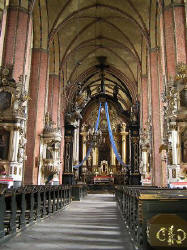 W prezbiterium na uwagę zasługują stalle dla kleru i rajców z XVII w.
