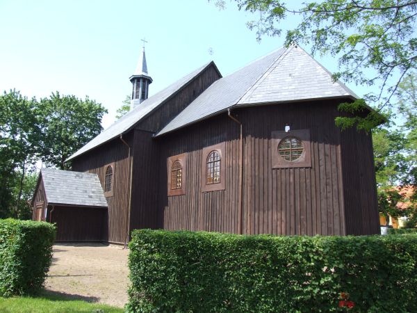 modrzewiowy, zrębowo-szkieletowy z prezbiterium zamkniętym trójbocznie.