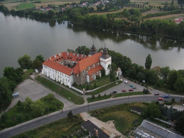 Zabudowania wznoszą się na pagórku wyniesionym ponad jezioro. Granicę