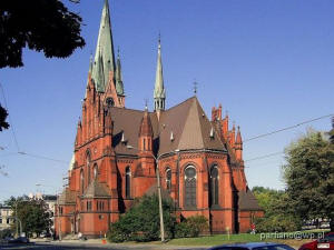 katolickiego kościoła garnizonowego Wojska Polskiego. Jest to neogotycka świątynia jednonawowa (30 m długa i 15,8 szeroka), która formą nawiązywała do architektury krzyżackiej. Kościół jako jedyny w Toruniu ma transept (nawę poprzeczną) i 86-metrową (najwyższą w Toruniu) czworoboczną wieżę z ośmiobocznym hełmem i czterema wieżyczkami narożnymi. W nawie i prezbiterium znajduje się sklepienie gwiaździste. W nawie i ramionach transeptu empory połączone są wąską galerią. Na ścianach empor i chóru organowego widać polichromie świętych, w niszach pod galerią – płaskorzeźby świętych. W oknach prezbiterium znajdują się witraże z postaciami świętych, a w 12 niszach – malowane postaci apostołów. W kościele znajdują się 35-głosowe organy z czasów budowy, a także rzeźby wykonane przez artystę Ignacego Zelka w latach 1924 i 1930 (nowy ołtarz główny). Ten sam rzeźbiarz jest autorem ołtarza polowego umieszczonego od zewnątrz od strony północnej. Wystrój malarski (w miejsce starszego) wykonał Kazimierz Mitera 1929. Wewnątrz liczne tablice pamiątkowe o charakterze patriotycznym. W ostatnich latach odbyły się prace remontowo-konserwatorskie, w wyniku których wyremontowany został dach świątyni, wieża, cztery tarcze zegarowe, a także elewacja południowa. |
