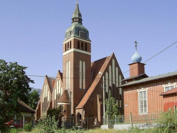Historia Kościół p.w. Matki Boskiej Zwycięskiej i św. Jerzego w Toruniu, dawniej kościół św. Jerzego, nawiązuje tradycją i wymiarami do średniowiecznego, gotyckiego kościoła św. Jerzego znajdującego się na Chełmińskim Przedmieściu. Kościół tamten, od XVI w. służący jako parafialny polskim ewangelikom z przedmieść Torunia, został rozebrany z powodów militarnych podczas wojen napoleońskich w 1811 r. Nabożeństwa parafii św. Jerzego, która nadal zachowała samodzielność administracyjną, odbywały się początkowo w kaplicy ewangelicko-reformowanej przy ul. Szerokiej, a potem w nowomiejskim kościele ewangelickim. Z inicjatywy pastora Reinholda Heuera w 1900 r. zakupiono parcelę na Mokrem (wówczas samodzielnej gminie) pod budowę kościoła i domu parafialnego. Honorowy patronat nad budową objęła cesarzowa Augusta Wiktoria. W sierpniu 1904 r. ukończono budowę secesyjnej plebanii. Kamień węgielny pod budowę świątyni położono 2 października 1905 r., a uroczystość poświęcenia miała miejsce 27 maja 1907 r. w obecności księcia Oskara Pruskiego. Po II wojnie światowej w 1945 r. kościół otrzymał wezwanie Matki Boskiej Zwycięskiej i stał się filialnym rzymskokatolickiej parafii Chrystusa Króla. W 1971 r. erygowano samodzielną parafię. W latach 80. XX wieku połączono powojenne i dawne wezwanie kościoła i parafii. Architektura Kościół jest budowlą ceglana, neogotycką, zwróconą prezbiterium na południe. Do szerokiego trójnawowego trójprzęsłowego korpusu przylega pięciobocznie zamknięte prezbiterium. Fasadę i elewacje boczne ożywiają trójkątne szczyty z jasnymi blendami. Wieżę dostawioną przy fasadzie od wschodu wieńczy neobarokowy hełm z zegarem. Wnętrze kryte jest sklepieniem krzyżowym i z trzech stron wypełniają je drewniane empory. Zabytkowe wyposażenie Wyposażenie wnętrza Kościoła jest skromne. Znajduje się tu m.in. kamienna płyta nagrobna Johanna Stranskiego z 1648 roku, przeniesiona z dawnego Kościoła św. Jerzego, relikwiarz św. Antoniego z 1888 roku. Z pierwotnego wyposażenia zachowała się także mozaika z wyobrażeniem głowy Chrystusa w zamknięciu prezbiterium, wykonana według drzeworytu Albrechta Dürera przez berlińską firmę Puhl und Wagner. Wizerunki adorujących aniołów namalował Wilhelm Sievers z Hanoweru. Wyobrażenie św. Jerzego w przedsionku wykonał prof. Wilhelm Süs z Karlsruhe, witraże o motywach ornamentalnych i roślinnych firma Ferdinand Müller z Quedlinburga. Pozostałe wyposażenie pochodzi już z okresu powojennego, w tym organy zbudowane przez firmę Józef Mollin w 1978 roku, wizerunek św. Jerzego o rysach ks. Jerzego Popiełuszki z lat 80. XX wieku oraz tablica pamiątkowa żołnierzy AK Inspektoratu Oszmiańskiego. |