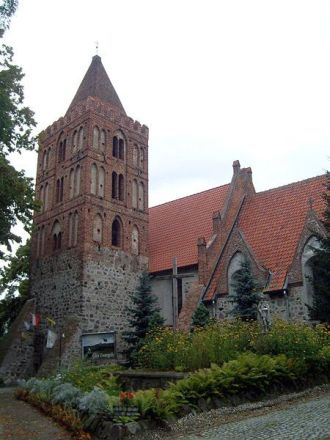 wieży ceglanymi o układzie gotyckim. Pierwotne prezbiterium wąskie,