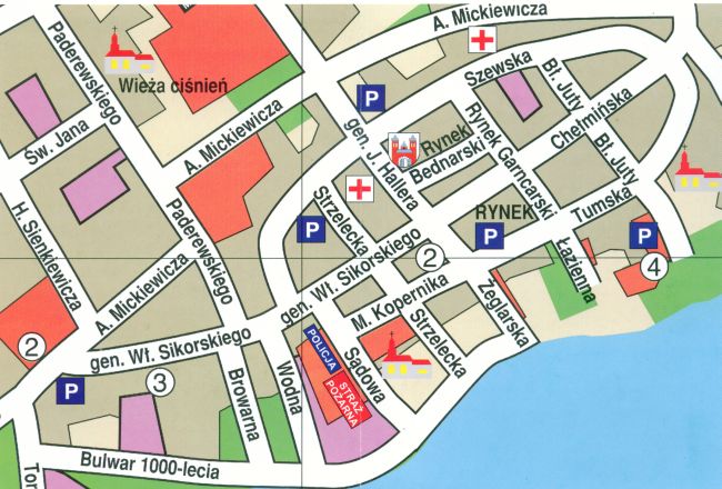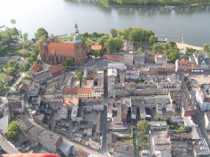 od północy wodami mniejszego jeziora "Miałkusz". W centrum średniowiecznego miasta usytuowano zbliżony do kwadratu rynek. Pierwotnie sięgał on swą powierzchnią północnej pierzei obecnego Rynku Bednarskiego i przecinał w połowie główny szlak komunikacyjny na linii wschód - zachód, wytyczony głównymi ulicami kierunkowymi: Chełmińską po stronie wschodniej i Toruńską (obecnie gen. Sikorskiego) od zachodu. Do tych ulic i do rynku dochodzą pod kątem prostym boczne ulice, tworząc charakterystyczny dla średniowiecznych założeń urbanistycznych układ szachownicy. Oprócz nazw dwóch głównych ulic kierunkowych znane są nazwy niektórych ulic bocznych: Tumska, Podmurna, Mieszczańska, Grubnieńska, Bociania, Browarna i Wodna. W południowo - zachodniej części miasta zlokalizowano kościół parafialny, posiadający pierwotnie wezwanie św. Jakuba, a obecnie św. Mikołaja. Południowo - wschodnią część przeznaczono na katedrę i zabudowania kapitulne. Miasto otoczone było od strony wschodniej, północnej i zachodniej murami obronnymi, które rozebrano w połowie XIX wieku. Funkcję obronną od strony południowej spełniała zapewne naturalna skarpa ziemna nad jeziorem. Dodatkowym murem otoczony był teren przykatedralny, bedący własnością kapituły, po którym do dziś zachowała się jedynie brama wjazdowa z niewielkim fragmentem przylegającego do niej muru. Mury miejskie , wykonane w przeważającej części z kamieni polnych, przy niewielkim użyciu cegieł i bez dodatkowych umocnień w formie wsporników miały niecały metr grubości i 9 metrów wysokości. W ciąg murów zapewne były wbudowane baszty, z których znana jest jedynie baszta Bociania. Dostęp do miasta prowadził przez bramy: Toruńską, Grudziądzką, Południową i Ceglaną. Miasto otaczały dwa przedmieścia: od zachodu - Przedmieście Toruńskie i od wschodu - Przedmieście Chełmińskie z usytuowanym na nim franciszkańskim kościołem św. Jerzego. |