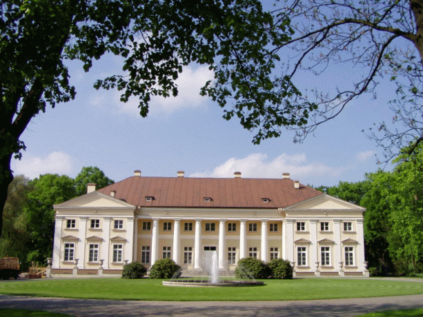 park otaczający pałac. Pałac w Kikole jest budowlą zwartą, dwukondygnacyjną, założoną na rzucie prostokąta z płytkimi ryzalitami skrajnymi w fasadzie, portykiem wgłębnym usytuowanym pomiędzy tymi ryzalitami oraz z głębokimi ryzalitami skrajnymi w elewacji tylnej, otwierającej się na założenie parkowe. Segment główny przykrywa dach czterospadowy, ryzality fasady otrzymały własne dachy dwuspadowe o kalenicach ustawionych poprzecznie w stosunku do osi wzdłużnej pałacu, zaś ryzality elewacji tylnej - dachy trójspadowe. Elewacja frontowa pałacu jest dwunastoosiowa. Triady skrajnych osi zajmują ryzality zwieńczone trójkątnymi frontonami, zaś siedem centralnych osi wypełnia portyk z toskańskimi kolumnami. Na elewacjach ryzalitów znajdują się toskańskie pilastry. Podział horyzontalny uzyskano za pomocą gładkiego fryzu, zastosowanego na elewacji wewnątrz portyku wgłębnego. Okna w częściach ryzalitowych posiadają ozdobę w postaci trójkątnych frontonów, natomiast okna w w portyku wgłębnym pozbawione są architektonicznej oprawy. Mury fasady wieńczy belkowanie złożone z architrawu, fryzu i gzymsu. Elewacja tylna, podobnie jak frontowa, jest trzynastoosiowa. Trójosiowe ryzality skrajne otrzymały taki sam schemat kompozycyjny i detal architektoniczny jak ryzality fasady, z tą jednak różnicą, iż ryzalitów nie wieńczą trójkątne frontony, zaś okna pozbawione są trójkątnych naczółków. Przed wgłębną częścią elewacji tylnej znajduje się ujęty ryzalitami taras, z niskimi murkami zwieńczonymi ozdobnymi wazami. Taras ten szerokimi schodami komunikuje się z położoną w obniżeniu terenu częścią parkową. Elewacja boczna wschodnia jest sześcioosiowa i posiada analogiczne jak w pozostałych elewacjach główne akcenty poziome, w postaci wydzielonego odsadzką cokołu oraz gzymsu. Belkowania poprowadzono jedynie nad skrajnymi osiami, wspierając je na toskańskich pilastrach. Cztery środkowe osie otrzymały postać pseudoryzalitu. Schemat kompozycyjny wschodniej elewacji bocznej powtórzono na elewacji zachodniej, z tym że pseudoryzalitem objęto tutaj siedem osi, zaś skrajne osie są znacznie węższe niż w elewacji wschodniej. Na parterze segmentu głównego wnętrza zakomponowano opierając się na schemacie dwutraktowym trójpasmowym. Pasmo główne tworzy sień oraz usytuowane za nią duże wnętrze z trzema wysokimi okna sięgającymi podłogi, otwierające się na taras przy elewacji tylnej. Po bokach pasma głównego zlokalizowane są po dwa pomieszczenia. Segment wschodni zajmują ujęte w jedno pasmo trzy wnętrza, z których centralne dwukondygnacjowe pomieszczenie, tzw. Sala Rycerska, zajmuje większą część. Segment zachodni zajmują analogiczne trzy pomieszczenia, z tym że centralne jest jednokondygnacjowe. Rozkład wnętrz na piętrze powtarza zasadniczo schemat parteru, z tą różnicą, że trakt frontowy segmentu głównego zajmuje wielki hol z parami kolumienek, wydzielających wschodnią i zachodnią cześć tego holu. Bogaty, malarski wystrój wnętrz pałacowych przetrwał do chwili obecnej jedynie w tzw. Sali Rycerskiej. Klasycystyczny pałac w Kikole, o zwartej i monumentalnej bryle, reprezentuje rzadkie na ówczesne czasy rozwiązanie wiejskiej siedziby rezydencjonalnej w wariancie z bardzo szerokim portykiem wgłębnym na osi fasady oraz z fasadą zakomponowaną na całej szerokości w wielkim porządku. Tworzona za pomocą pilastrów wertykalna artykulacja pojawia się również w oszczędniejszej formie na elewacji tylnej oraz na skrajach elewacji bocznych. Założenie pałacowo - parkowe w Kikole należy do najciekawszych kreacji artystycznych końca XVIII i początku XIX w. na terenie ziemi dobrzyńskiej. Ród Zboińskich posiadał pałac w Kikole do 1855 roku, kiedy przejęli go Piwniccy. Od 1902 roku dobra Kikół objął Władysław Nałęcz, wraz z żoną Franciszką Jadwigą z Krasińskich. W Kikole prowadził hodowlę koni krwi szlachetnej, był również inicjatorem powstania mleczarni i cegielni w Kikole. Zmarł w 1934 roku, a majątek odziedziczył po nim syn Stanisław. Kryzys gospodarczy spowodował, że zadłużone dobra w Kikole zostały zlicytowane w 1937 roku i stały się w dużej części własnością cukrowni Chełmica, a w pałacu utworzono szkołę. W okresie wojny pałac uległ zniszczeniu, a w 1945 roku przejął go na własność Skarb Państwa. Pałac w Kikole odbudowany został w 1966 roku i przez jakiś czas służył jako ośrodek wczasowo - kolonijny. Obecnie w prywatnych rękach. |
