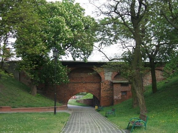 najprawdopodobniej najstarszy zachowany most w Polsce. Do wysunięcia takiego twierdzenia skłoniła miejscowych badaczy analiza materiału z jakiego zostały wykonane najstarsze fragmenty zabytku. Są to charakterystyczne dla architektury pierwszej poł. XIII w. płyty ceglane oraz cienka "oliwska" cegła. Najstarszą część mostu stanowi arkada o łagodnym łuku, zbudowana właśnie z takiej cegły. Najprawdopodobniej takich arkad jest więcej, lecz zostały zakryte późniejszymi konstrukcjami. Nad późnoromańską arkadą znajdują się bowiem łuki gotyckie, wykonane z grubszej cegły tzw. "palcówki" i są efektem XIV-wiecznej przebudowy mostu. Także przypory podtrzymujące przęsła pochodzą z XIV wieku. Ciekawostką jest fakt, że przęsło mostu nie było na środku prześwitu Bramy Toruńskiej. Powinno być pod obecnymi torami tramwajowymi a jest w znacznej mierze pod chodnikiem od strony Wisły. Świadczy to o wybudowaniu mostu dużo wcześniej przed powstaniem Bramy Toruńskiej. Zapewne most ten był pierwowzorem dla średniowiecznego ceglanego mostu na Placu Zamkowym w Warszawie. Mosty w Grudziądzu i Warszawie należą do kategorii łukowych, wykorzystujących mur arkadowy o grubości około 1-3 m, na który nakładano drewniany pomost. W okresie późniejszym przebudowano je na całkowicie murowane. W Grudziądzu miało to miejsce na przełomie XIV i XV w. Jeśli badania naukowców potwierdzą dotychczasowe ustalenia, most w Grudziądzu będzie najstarszym murowanym tego typu zabytkiem w Polsce. Most przerzucony nad dawnym kanałem młyńskim prowadził od południa przez Bramę Toruńską do miasta. Na zabytkowe konstrukcje ceglane nałożone są warstwy młodsze, XIX i XX-wieczne. Most do dzisiaj nie stracił swej funkcjonalności i nadal pełni rolę łącznika komunikacyjnego - przebiega przez niego jezdnia, linia tramwajowa i chodnik dla pieszych. Jeszcze w latach siedemdziesiątych XX w. płynęła pod nim woda kanału Trynka, obecnie pod mostem prowadzi alejka spacerowa. |