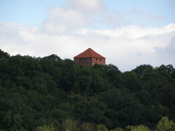 samotnie wieża zamku głównego i fragmenty murów obronnych okalających