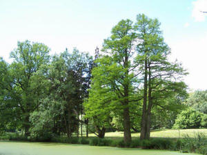 obszerny trawnik ze swobodnie rosnącymi drzewami i kępami krzewów.