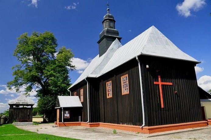 drewnianym przy kościele w Modzerowie. Aby trafić do kościoła należy na