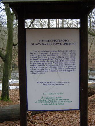 | opis: | Uroczysko "Piekło" przedstawia wyjątkowe wartości geomorfologiczne, geologiczne, geobotaniczne oraz krajobrazowe. Pod względem fizyczno-geograficznym leży on na terenie rozległej równiny sandrowej Borów Tucholskich zbiegającej na południe wzdłuż Gwdy, Brdy i Wdy, makroregionie Pojezierza Południowopomorskiego. Jest to obszar ostatniego zlodowacenia bałtyckiego (forma młodoglacjalna) i charakteryzuje się bogatą siecią rzek, dolin przełomowych, brust rynnowych oraz jezior. Przykładem doliny przełomowej jest właśnie uroczysko "Piekiełko", gdzie Brda wytworzyła głęboki o urozmaiconej rzeźbie wąwóz w paśmie wzgórz moreny czołowej. Ściany wąwozu posiadają tu nachylenie dochodzące nierzadko do 50 stopni. Mimo dość wartkiego nurtu, Brda zmienia na obszarze rezerwatu kilkakrotnie kierunek spływu, tworząc liczne meneandry, wiry i bystrzyce powodujące miejscami podcięcia brzegów, w wyniku czego występują erozyjne osuwiska i urwiska zboczy doliny. Dno rzeki miejscami wysłane jest głazami dużych rozmiarów pochodzących z rozmytej moreny czołowej. Grupa głazów tego rodzaju występuje między innymi na wysokości oddziału 125, tworząc w korycie rzeki próg zwany przez wioślarzy oraz miejscową ludność tzw. "Piekłem". Nazwa ta przyjęła się zapewne od tego, że próg ten stanowi poważną przeszkodę w wioślarstwie. Obecnie (po zbudowaniu tamy w Koronowie) skupiska głazów narzutowych praktycznie nie widać - zawsze zalewa je wysoki poziom wody. Widoczne są jedynie pojedyncze kamienie przy brzegu. Decyzją wojewódzkiej rady narodowej w Bydgoszczy, skupisko to uznane zostało uznane za pomnik przyrody. Piękno krajobrazu doliny Brdy podziwiać można z punktu widokowego zwanego "niebo", występującego w podziale 125a. | |