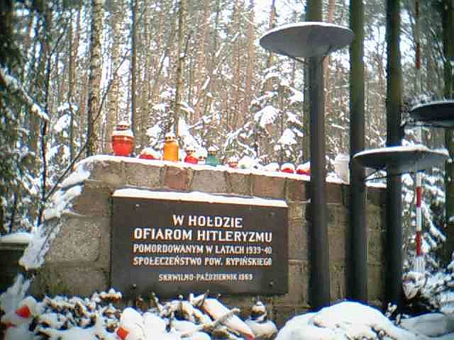 W latach 1939-1945 w lesie skrwileńskim koło miejscowości Rak hitlerowcy dokonywali masowych egzekucji. Trudno precyzyjnie określić ilu Polaków i Żydów zostało tam wówczas zamordowanych, z badań przeprowadzonych w 1945 r. wynika, że mogło tam zostać pogrzebanych około 1450 zwłok. Zdaniem niektórych badaczy w owym okresie mogło zginąć z rąk niemieckich okupantów nawet 2 tysiące mieszkańców powiatu rypińskiego. Wśród ofiar znajdowali się między innymi: członkowie żydowskiego Judenratu z Rypina (zamordowani pod koniec października 1939 r.), blisko 65 nauczycieli podstępnie aresztowanych podczas urządzonej przez Niemców pedagogicznej "konferencji", wielu księży, urzędników, ziemian, rzemieślników i harcerzy. Niemieccy zbrodniarze mordowali również w "Domu Kaźni" w Rypinie, a do skrwileńskich lasów przywozili trupy i tu zakopywali w wielkich dołach. Masowe zakopywanie zwłok pośród skrwileńskich lasów trwało od jesieni 1939 do 1944 roku. Pod koniec wojny hitlerowcy starali się szybko zacierać ślady swoich zbrodni. Wykopywano zwłoki i palono na stosach. Ale udało się to tylko częściowo. Nie wszystkie ciała spopielił ogień. Po wojnie odkryto siedem masowych grobów pomordowanych. Jeden wielki, w kształcie litery L, o długości 40 i szerokości 2,72 metra oraz sześć nieco mniejszych. Po odnalezieniu masowych grobów, część prochów przeniesiono w pobliże skrwileńskiej szkoły, gdzie z czasem wystawiono pomnik. Miejsce straceń w Raku upamiętniono obeliskiem i płytami nagrobnymi. |